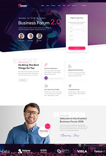 Present all the speakers and participants in GenesisExpo`s beautiful layouts. Choose your favorite variant of layout and create your own. You can create also single speaker profile with all relevant information.